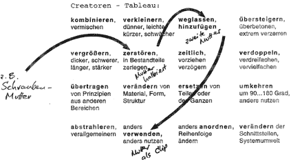 Impuls 2 ----------------------------------------------------------------------- Silverstone 1999: der Formel-1-Weltmeister Mika Häkkinen schießt aus der Box und verliert eines der gerade montierten Räder: eine Schraubenmutter hatte sich in der Hektik verkantet und löste sich während der Fahrt. Eine Schraubenmutter, die so etwas verhindern kann und schlagartig ohne Drehung angezogen wird, hat Arno Giehl entwickelt. Seine Idee wurde kürzlich mit Euro 10000.- im start2grow-Wettbewerb ausgezeichnet. Die kreative Lösung: die Mutter wird halbiert und die zwei Hälften an das Schraubengewinde angelegt. Danach wird eine zweite Mutter (ohne Gewinde) darüber gestülpt und damit die beiden Mutter-Hälften zusammenpresst. Klick - die Mutter ist fest, geöffnet wird sie wie gewohnt. (Quelle: tremonia nova, Heft 4, Juni 2003) Impuls 3 ----------------------------------------------------------------------- Video-Konferenzen verringern die Kreativität von Teams signifikant gegenüber face-to-face meetings. Das stellte eine experimentelle Untersuchung des Instituts für Arbeitswissenschaft der Ruhr-Universität Bochum fest. Als Ursache dafür wurde die Beobachtung angeführt, dass bei gleicher Aufgabenstellung in der face-to-face-Arbeit ein "schnellerer" Gesprächsstil vorherrschte als bei den Teams mit Video-Konferenz. "Schneller" hieß: kürzere Einzelbeiträge, häufige Unterbrechungen. Bei Aufgaben für das eher logische Problemlösen dagegen konnte kein Unterschied zwischen den beiden Arbeitsweisen festgestellt werden. Konsequenzen für (virtuelle) Teams: Video-Konferenzen gezielt nur dann einsetzen, wenn nicht kreatives Problemlösen erforderlich ist oder: durch entsprechende Regeln und Moderation einen "schnelleren" Stil zu trainieren. (Quelle: Wirtschaftspsychologie, Heft 3, 2001) Impuls 4 ----------------------------------------------------------------------- Den schnellen Denkstil des starken Kreativen beschreibt der verstorbene russische Erfinder der Ideenfindungs- methode TRIZ, G.S. Altschuller am Beispiel der Entwicklung eines Hochleistungs- Rennbootes: "Der gewöhnliche Erfinder lässt sich von dem existierenden Rekordrennboot leiten. In dieses Ausgangsbild bringt er verschieden Veränderungen hinein. Ein schwacher Erfinder betrachtet jede Variante lange (...). Die Varianten unterscheiden sich nicht viel vom Ausgangstyp (...). Ein starker Erfinder sichtet die Varianten mit Kühnheit: in seinem Kopf wechseln die Vorstellungen , es tauchen ungewöhnliche Bilder auf. Siebenundsechzigste Variante. Und wenn man das Schiff mit einer Art Gepardenfell überzieht? (...) vielleicht verhindert das Fell die Wirbelbildung? (...). Das erste Merkmal des talentierten Denkers ist die Fähigkeit, vom System zum Obersystem oder zum Untersystem überzugehen (...). Eines der Untersysteme des Schnellbootes ist z.B. der Rumpf. Je größer die Geschwindigkeit, desto größer ist der Widerstand des äußeren Mediums (...). Den idealen Rumpf hat man also dann, wenn es gar keinen Rumpf gibt. Der Motor dagegen, ein anderes Untersystem des Bootes, strebt danach, größer und leistungsfähiger zu werden . Gib ihm seinen Willen und er füllt den ganzen Rumpf aus, wächst über den Rumpf hinaus. Der Kampf dieser beiden widerstreitenden Tendenzen bestimmt die Entwicklungslinie der Untersysteme (...). Bilder und Symbole für Gedanken ziehen wie im Film auf mehreren Leinwänden abwechselnd und zugleich durch die Vorstellung des talentierten Denkers (...). Die gegensätzlichen Tendenzen stoßen zusammen, (...) in diesem Kampf wird das Bild durch das Gegenbild ersetzt. Neben dem Boot entsteht das Antiboot. Das gewöhnliche Boot schwimmt, also schwimmt das Antiboot nicht. Ein Schiff, das sich nicht auf dem Wasser halten kann (...). Vom Standpunkt des normalen Denkens ist das einfach unsinnig. Und wenn man es trotzdem durchdenkt? (...). Das Antischiff ist nicht verpflichtet, sich auf dem Wasser zu halten. Folglich kann man es bis zum äußersten mit (...) Motoren füllen (...). Bei Bewegung wird es sich aufgrund der Auftriebskraft, die von den unter Wasser liegenden Tragflächen hervorgerufen wird, halten (...). Die Idee des Antischiffes erscheint schon nicht mehr so verwegen. Im Gegenteil: befremdend erscheint die gewöhnliche Konstruktion, bei der der unter Wasser liegende Rumpf ein großes Volumen behält, das nur bei langsamer Fahrt benötigt wird." (Quelle: G.S. Altschuller: "Erfinden - Wege zur Lösung technischer Probleme", BTU Cottbus 1998, Hervorhebungen durch DIRLEWANGER IDEE. Auf Wunsch senden wir Ihnen eine Kopie des vier Seiten umfassenden Kapitels.) Impuls 5 ------------------------------------------------------------------------ Das explorierende Hin- und Herspringen zwischen "Fenstern" ("Leinwänden"), wie es von Altschuller beschrieben wird (siehe vorherigen Impuls) praktizieren Kreative oder Personen, die (fachlich) wenig mit der Aufgabenstellung zu tun haben. Das beobachten wir in Ideenfindungs-Workshops immer wieder. Dieser "schnelle" Stil kann trainiert und durch eine einfache methodische Hilfe unterstützt werden, indem man sich der schon von Brainstorming-Erfinder Alexander Osborn vorgeschlagenen Denk-Operatoren-Checkliste systematisch bedient. In unserer Praxis hat sich ein Matrix-Tableau in der Größe A3 oder A1 (Flipchart-Größe) bewährt, in dem diese "Creatoren" eingetragen sind. Man schreibt die Idee/Aufgabenstellung auf eine Karte, mit der man auf dem Tableau von Feld zu Feld springt und dann jeweils die entsprechenden Creatoren gedanklich anwendet (z.B.: vergrößern, anders nutzen, umkehren, ...).